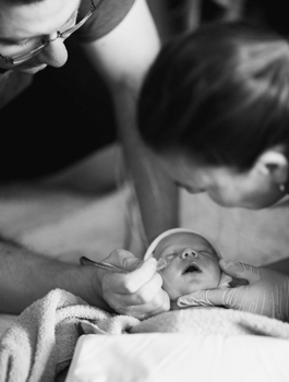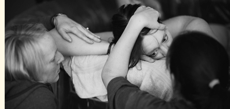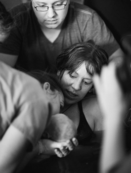 The midwives turned their attention toward me and noticed the severity of my hemorrhage. They lifted me out of the tub, placed me on the couch, and administered pitocin in my leg and methergine in an IV. Katie held my uterus firmly between her hands and my doulas cut a piece of the placenta and put in under my tongue. I was pale and weak and I was struggling to stay conscious. I remember thinking that I had to stay awake, because if I closed my eyes, I wouldn’t wake up. I fought hard to keep my eyes open and waited to hold my baby.